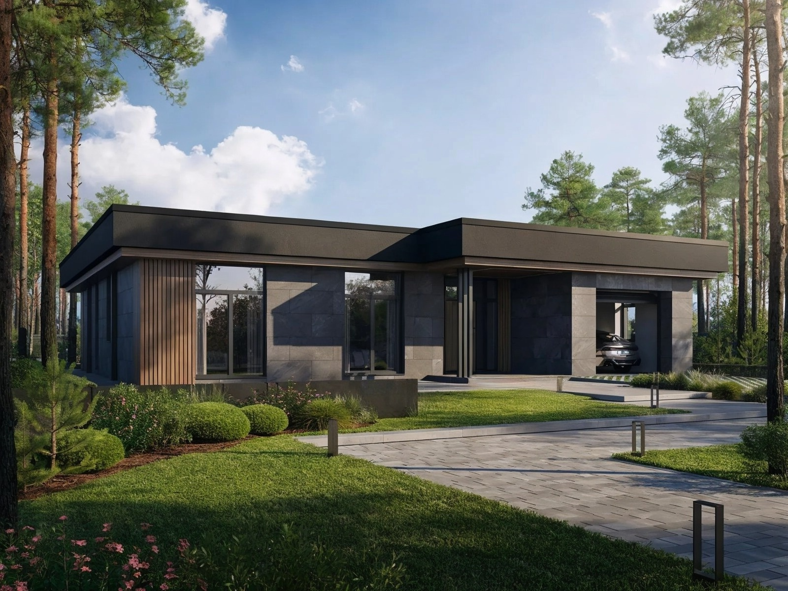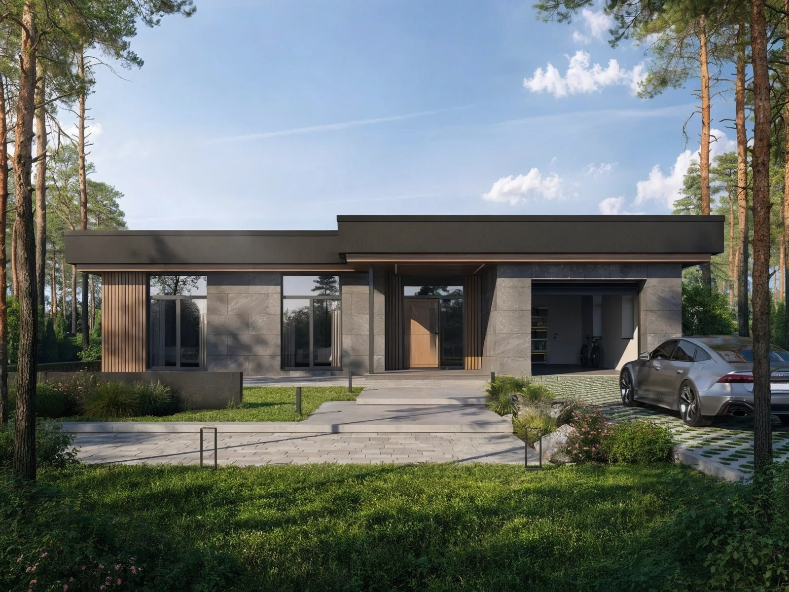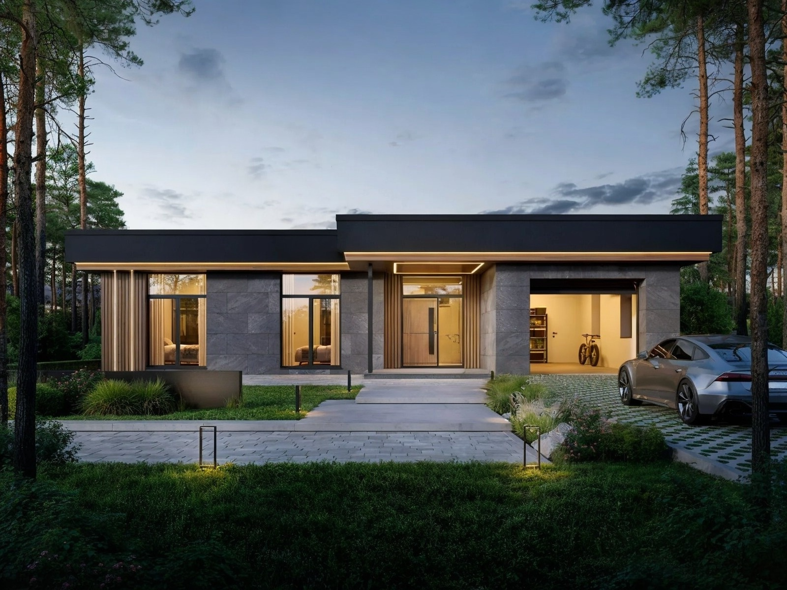 Дом оборудован встроенным гаражом, двумя кладовыми, техническим помещением и тамбуром. Всё здесь подчинено логике комфорта: минимум коридоров, максимум функциональности, максимум света и воздуха.