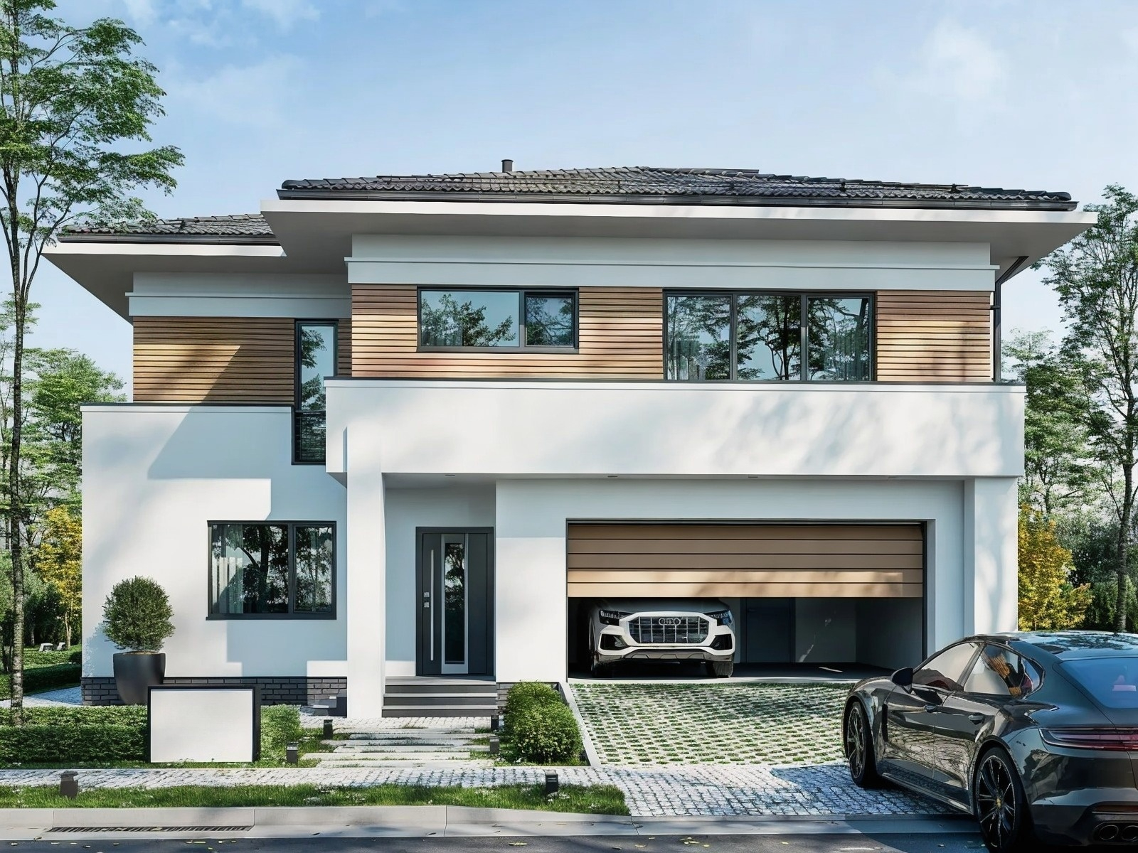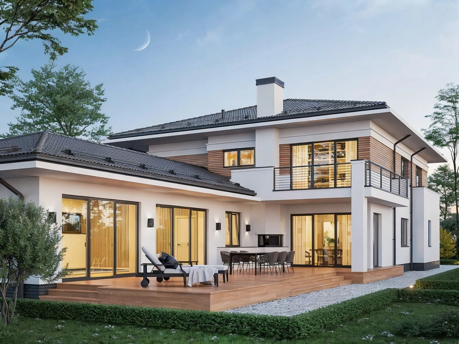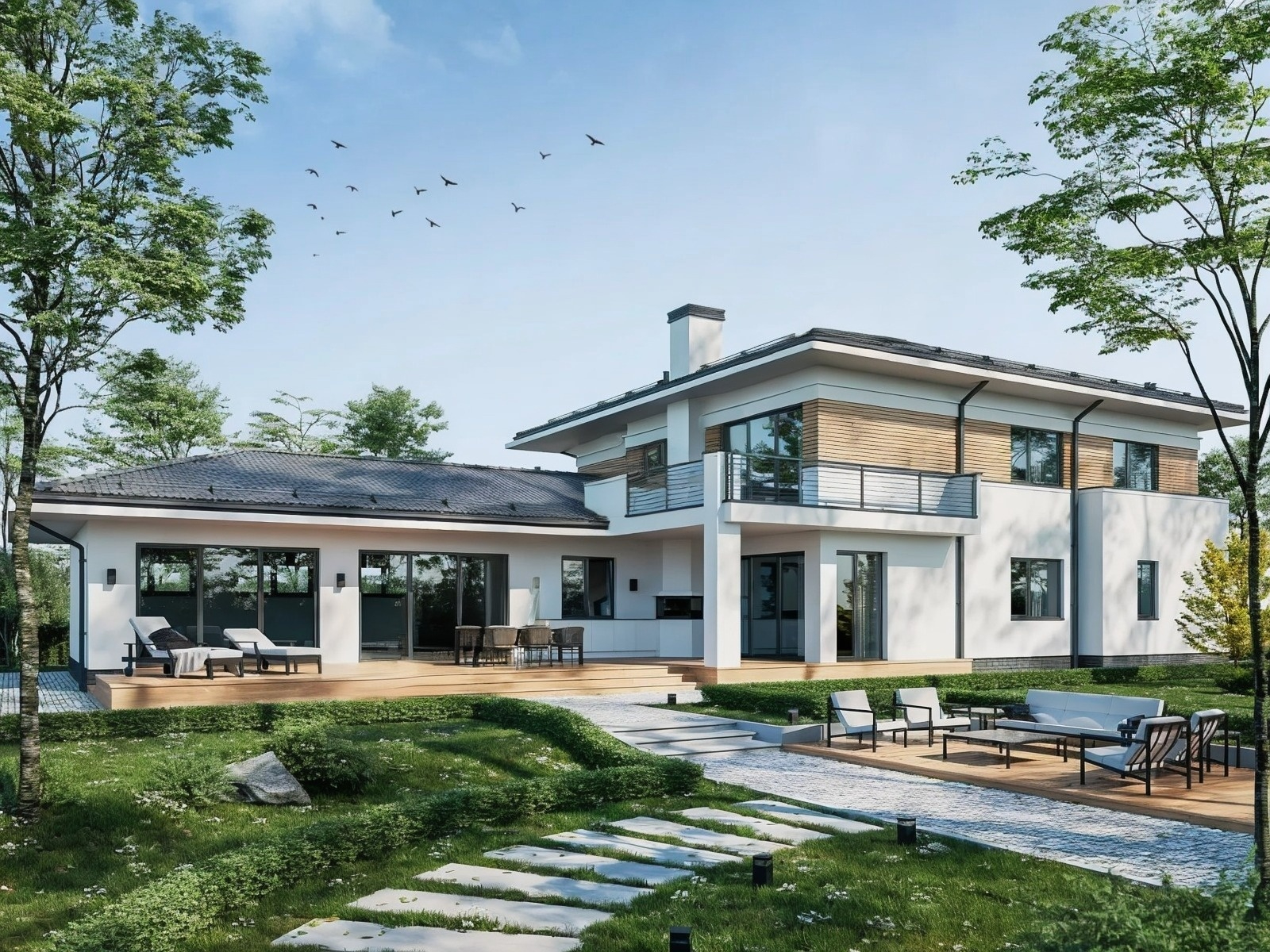 Дом идеально подходит для семьи, ценящей простор, уют и современную эстетику с нотами классики. Большие панорамные окна, природные материалы в отделке и акцент на горизонтальные линии создают ощущение единения с природой, так характерное для стиля Райта.