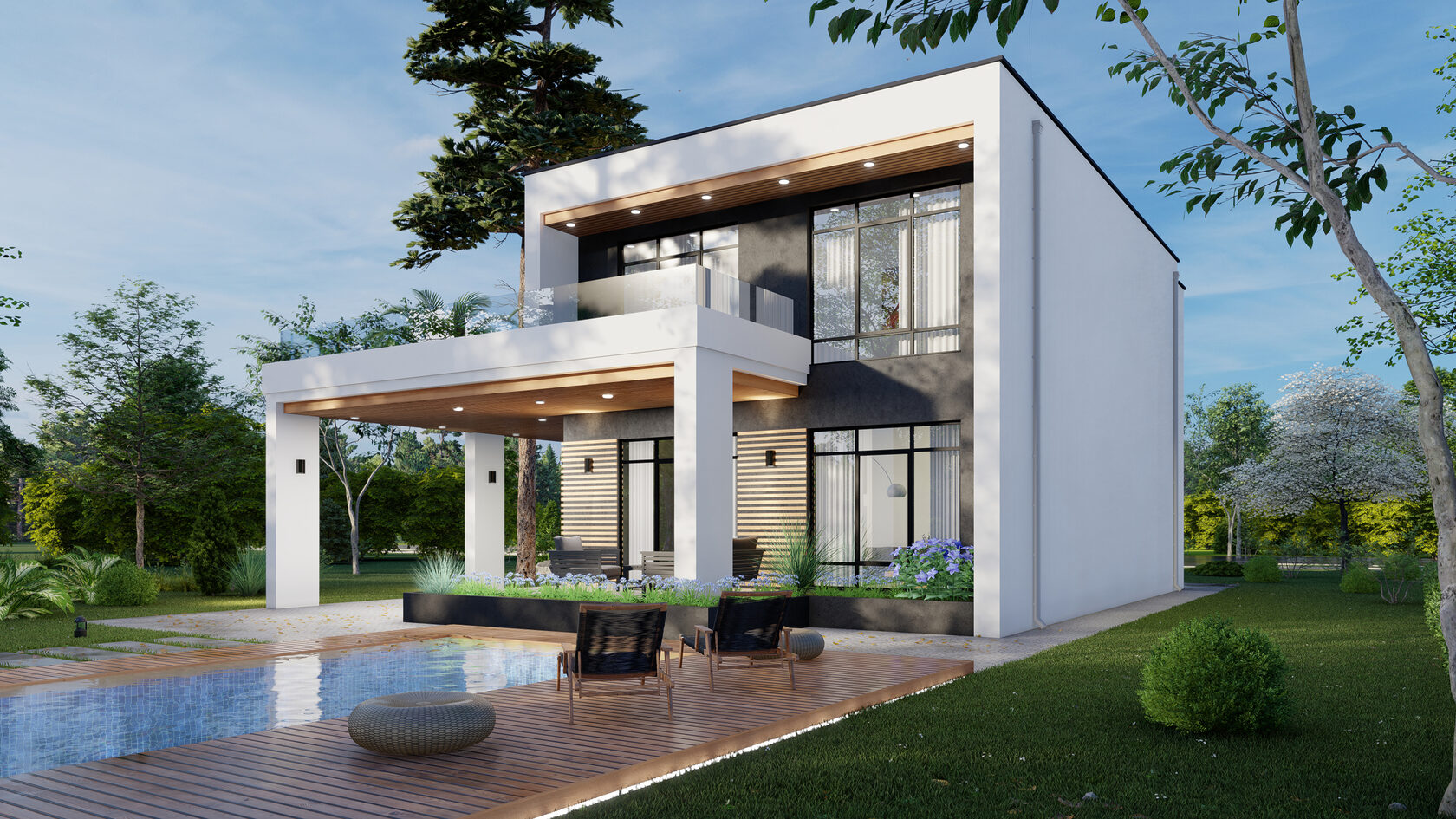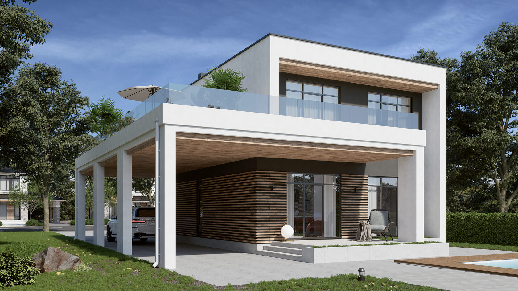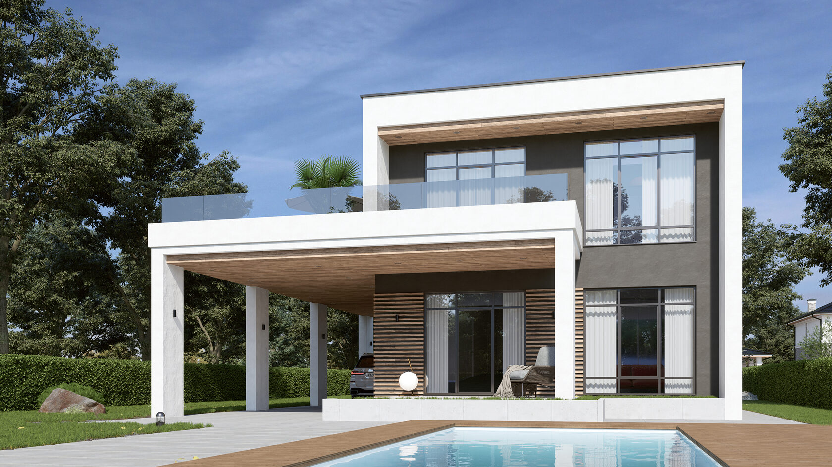 Стильный дом, который будет всегда наполнен светом и воздухом за счет больших витражных окон. В нем с радостью сможет жить большая семья!