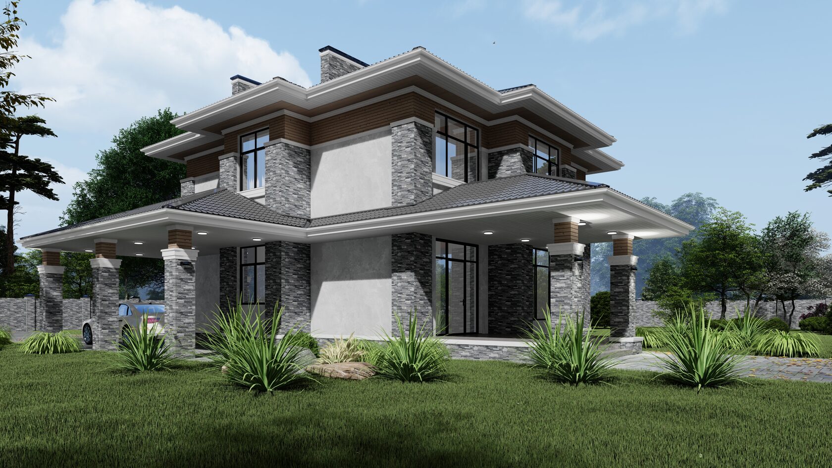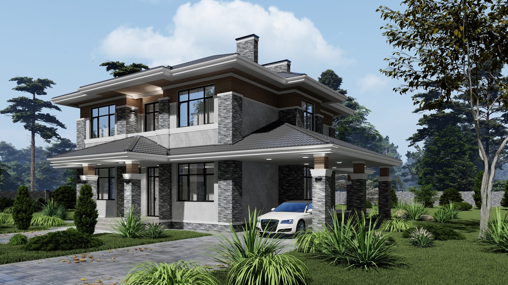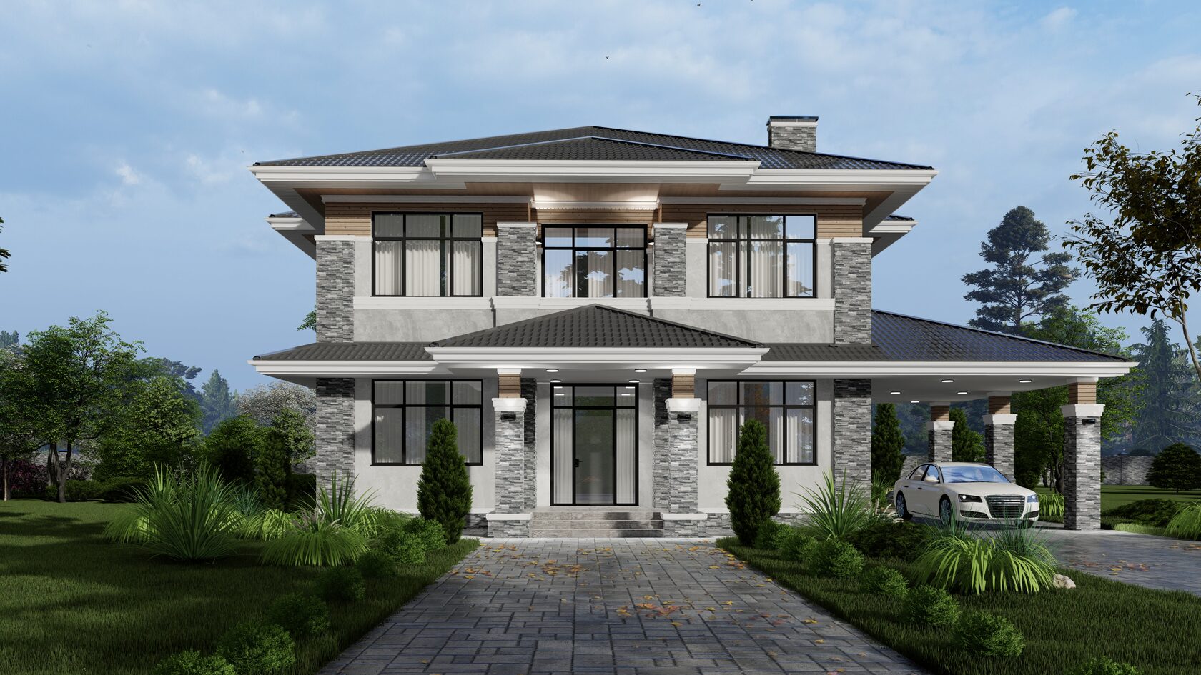 Двухэтажный дом в стиле Райта. Основная архитектурная задумка этого красивого проекта — это второй свет в большой зоне, объединяющей гостиную, кухню и столовую