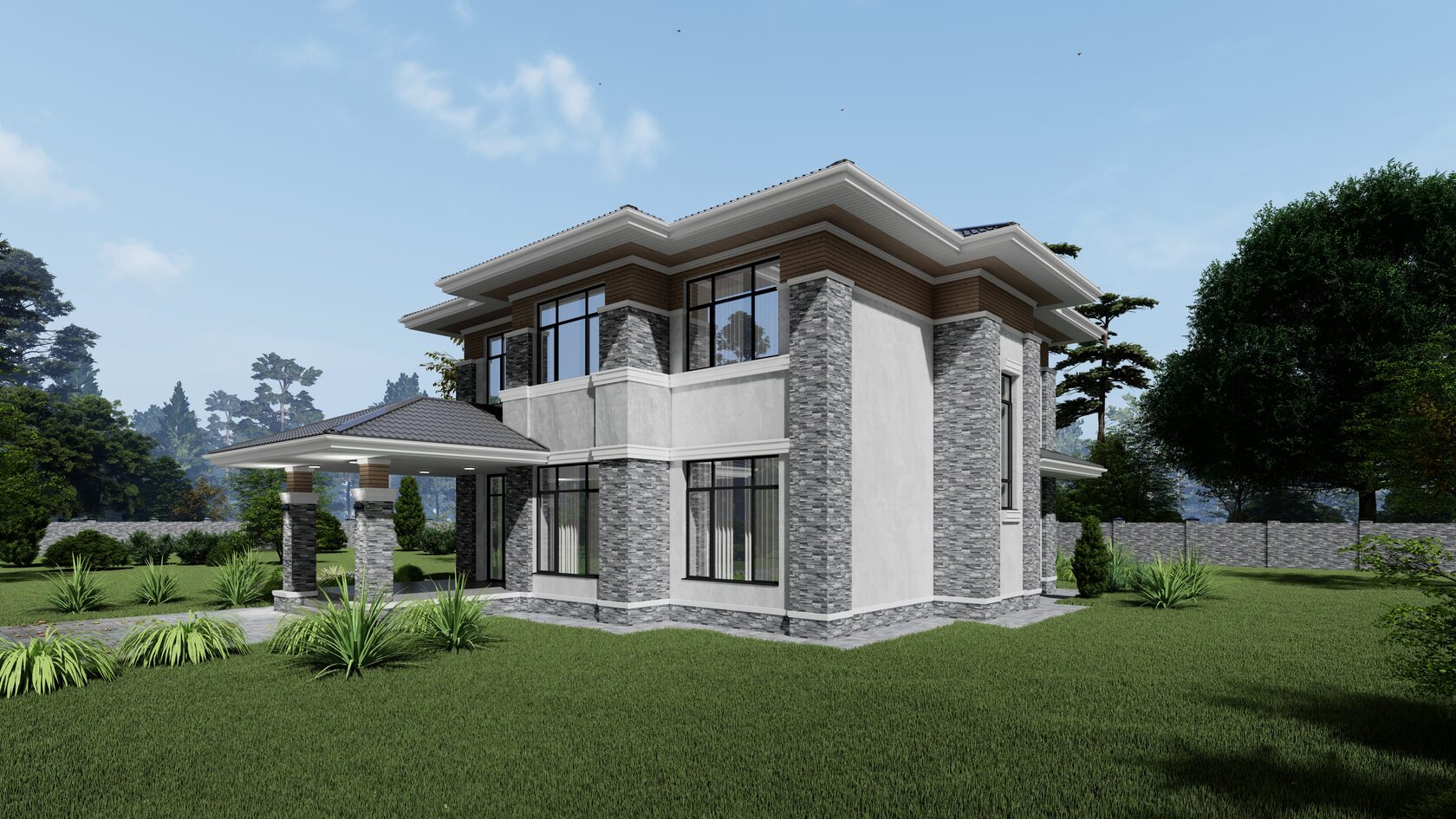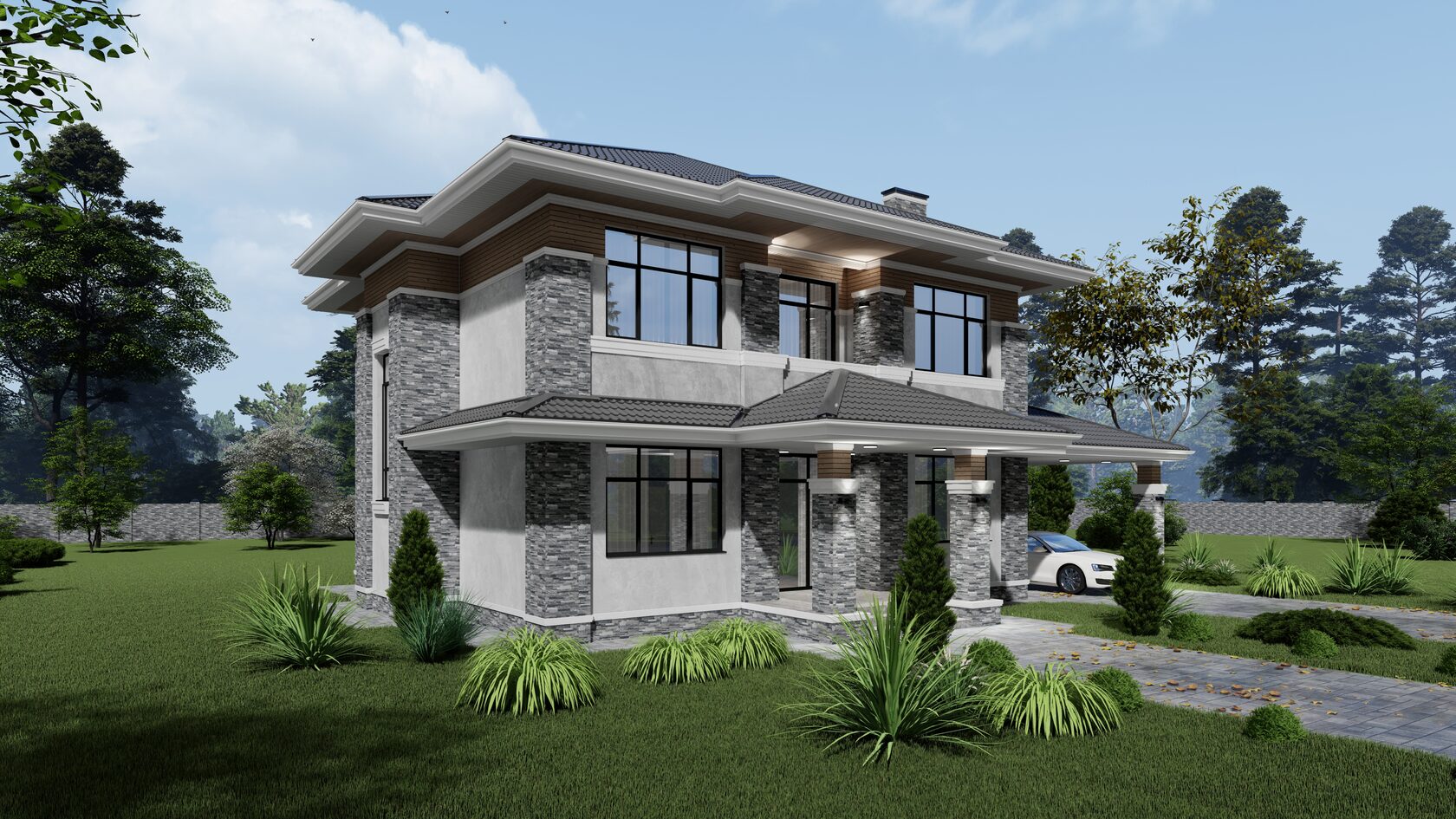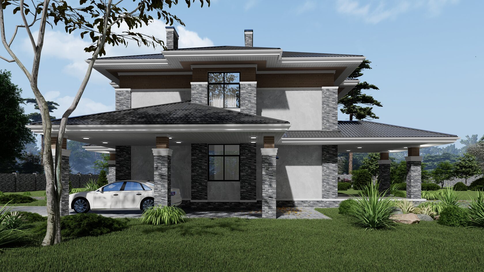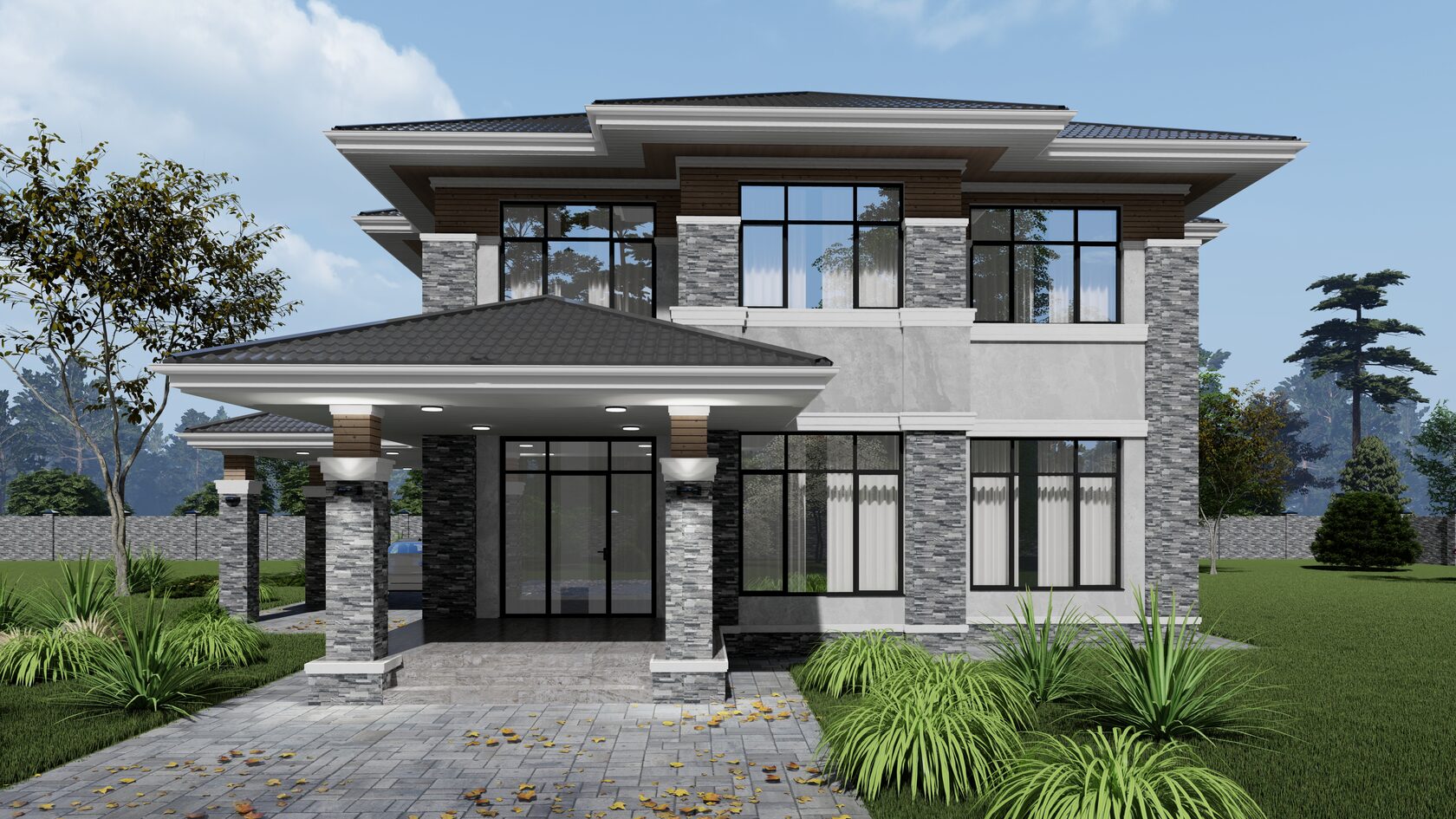 Двухэтажный дом в стиле Райта. Основная архитектурная задумка этого красивого проекта — это второй свет в большой зоне, объединяющей гостиную, кухню и столовую