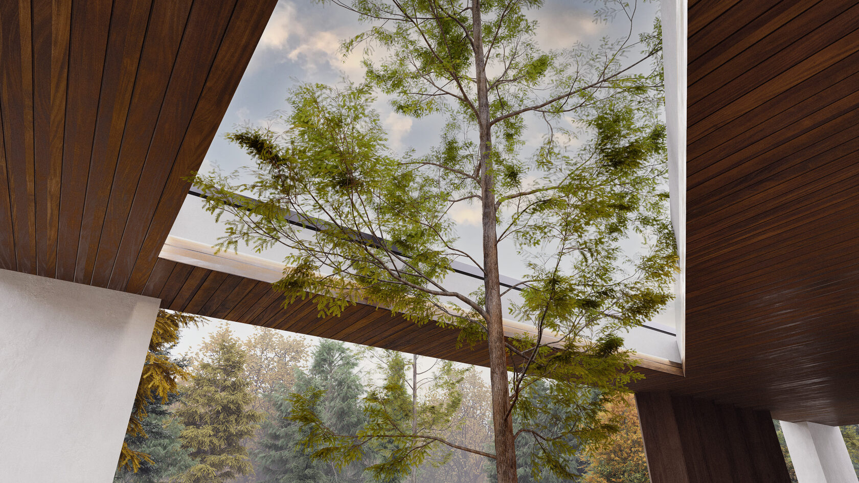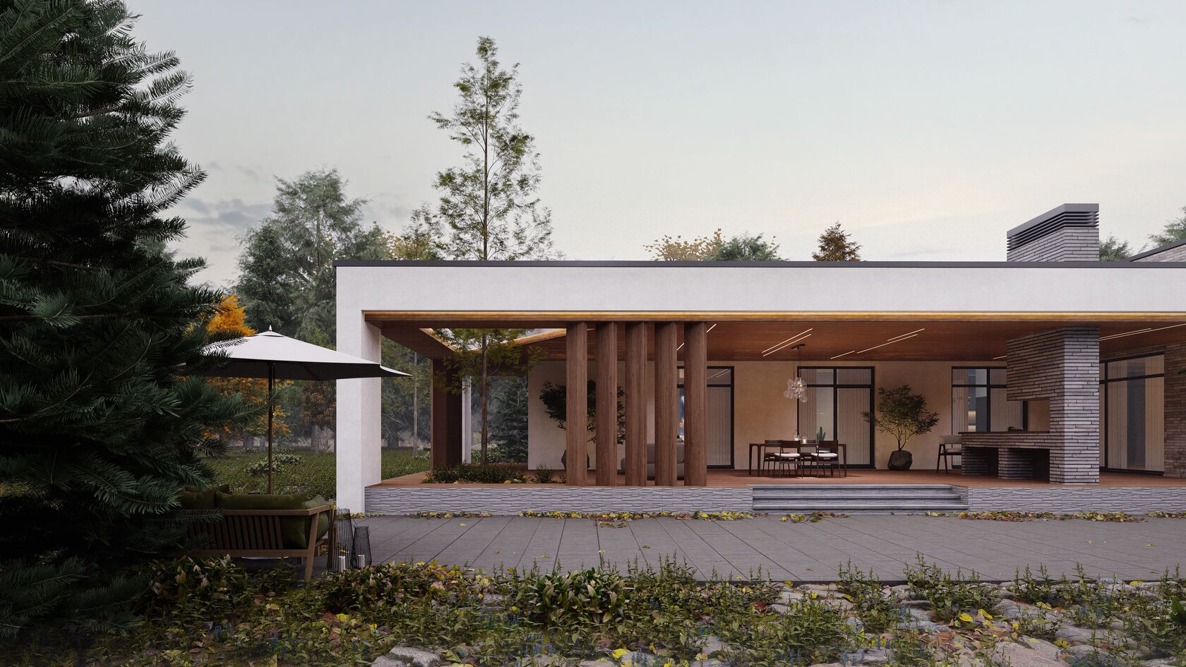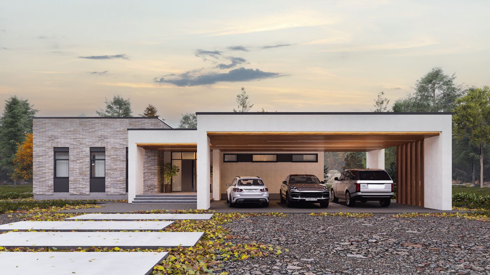 Здесь сочетаются фасадная штукатурка в двух светлых оттенках с фиброцементными плитами под дерево, которые плавно переходят в ограждения на эксплуатируемой кровле. Они подчеркивают геометрию дома и придают ему легкость.