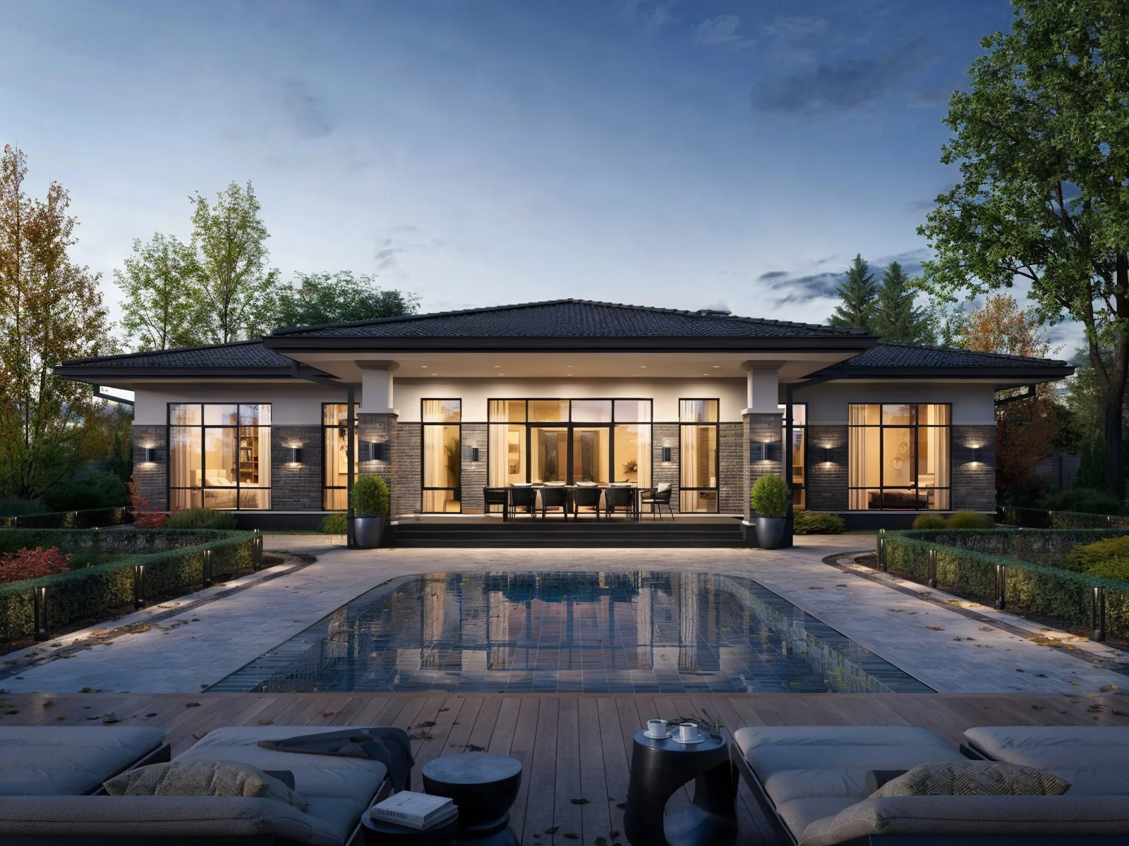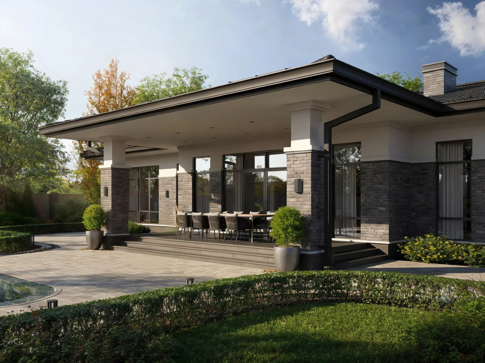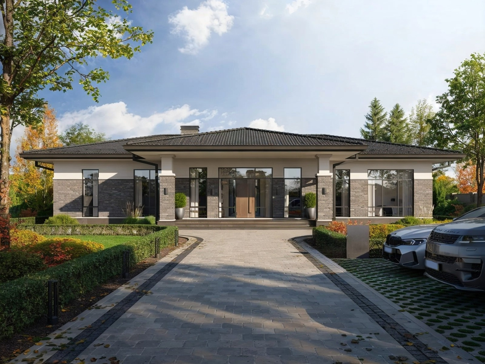 Этот просторный одноэтажный дом площадью 214 м² идеально подойдёт для большой семьи, ценящей комфорт, функциональность и стиль. В архитектуре фасада сочетаются светлая декоративная штукатурка, тёмный облицовочный кирпич и классическая кровля, что создаёт благородный и одновременно современный образ.